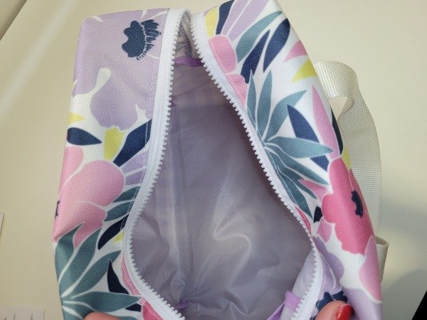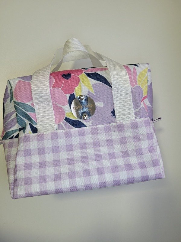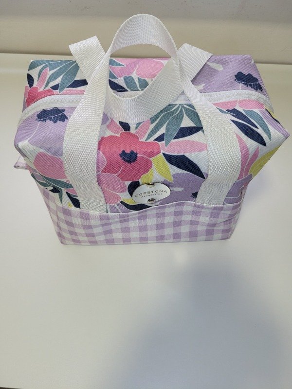Es super amplia mide 18 de alto 23 de ancho y 13 de fuelle. Posee manijas d e agarre y su interior es impermeable .